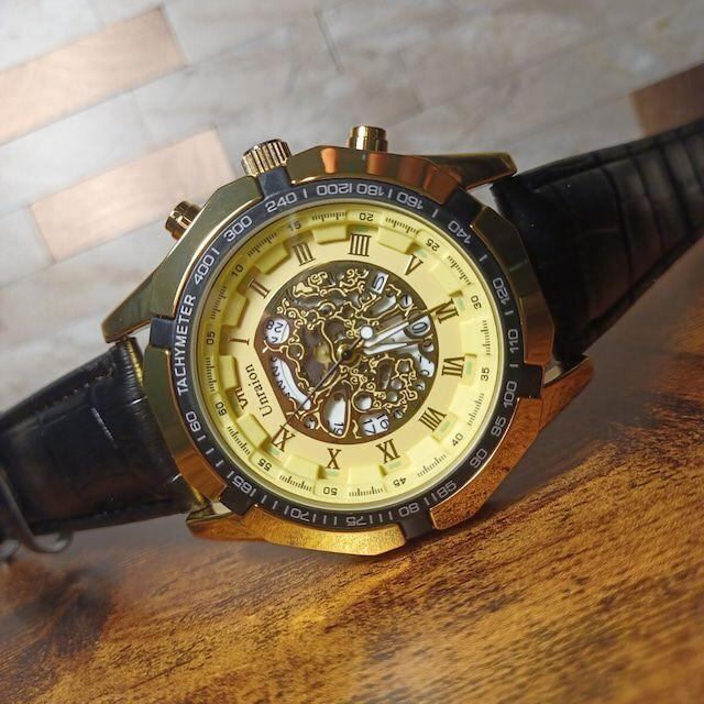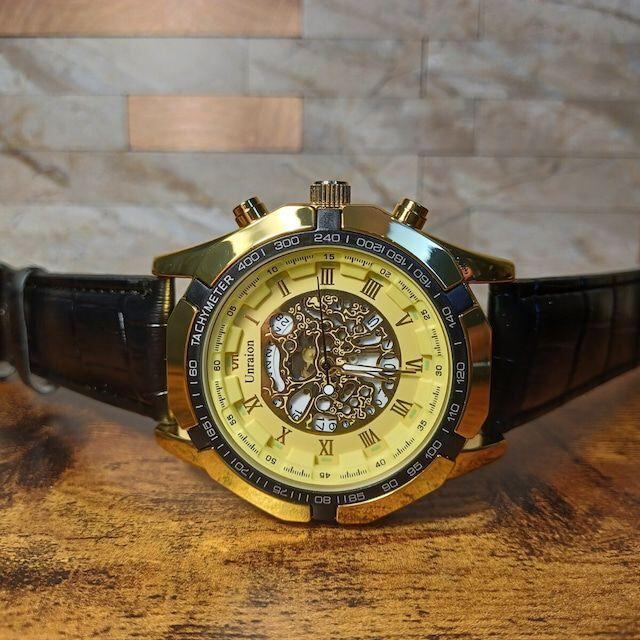 新品 彫スケルトンUnraion 腕時計 レザー 金