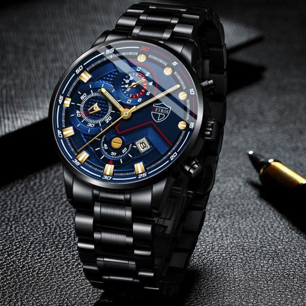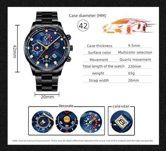 新品 クロノグラフ DEYROS 腕時計メンズ 黒青